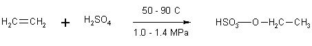 Students learn to describe the addition of water to ethene resulting in the production of ethanol and identify the need for a catalyst in this process and the catalyst used Ethanol can be made in two ways: by fermentation of sugars, or by hydration (adding water) to ethene. Due to the low costs of ethene as a raw material, approximately 95% of the industrial ethanol made in the developed world is produced by the second process. The double bond of ethene is electron rich. and is liable to attack by any chemical species that is poor in electrons. The hydrogen ion, H+, is perhaps the simplest example of such a species, and for this reason strong acids are used to hydrate ethene. One synthetic route involves the use of concentrated sulfuric acid; H+ adds across the double bond, generating a cation, which receives two electrons from the HSO4- ion to form ethyl sulfate.