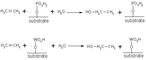 Obviously, reactions that involve the use of huge amounts of sulfuric acid, no matter how cheap the reagents are, pose many problems with safety, environmental impacts, and maintaining plant in an un-corroded state. In recent decades, this reaction has been replaced by the use of highly acidic catalysts made by impregnating zeolites or silica aerogels with phosphoric or tungstic acid. These provide the equivalent 'concentrated acid' regime on a microscale at the surface. These convert ethene to an immobilised phosphate or tungstate which can be hydrolysed in place, regenerating the catalyst and giving ethene in a one-stage process.