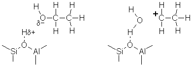 The best way to do this is to use a zeolite catalyst, in much the same way as is done in the cracking of hydrocarbons. A zeolite can provide highly reactive sites in a controlled environment, safe from the chaos that prevails in a solution. The exact mechanism of this process is unclear, but the crucial step can be thought of as an acid-base reaction. One way to break up ethanol is to give a base - the hydroxy, OH- ion - and an acid - the ethyl carbenium ion, CH3CH2+. Strongly acid sites in the pores of the zeolite attack the OH substituent of ethanol, giving a water molecule bound to the surface and an ethyl carbenium ion.