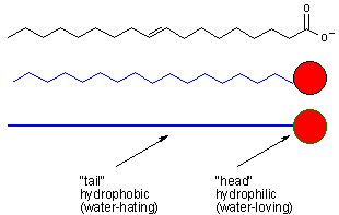 Surface active agents or surfactants have a distinct molecular structure that gives rise to their molecular properties. [extra background] Soaps such as sodium oleate are examples of a class of molecules called surfactants. The name "surfactant" comes from somebody who we don't think would spell very well - it actually stands for SURFace ACTive AgeNT. Both detergents and soaps are classed as surfactants. Surfactants are characterised by the essential features that we saw in sodium oleate. A surfactant molecule has a hydrophilic (water-loving) head and a long hydrophobic (water-hating or oil-loving) tail. For this reason, we often describe surfactants is being amphiphilic molecules - they love everything.